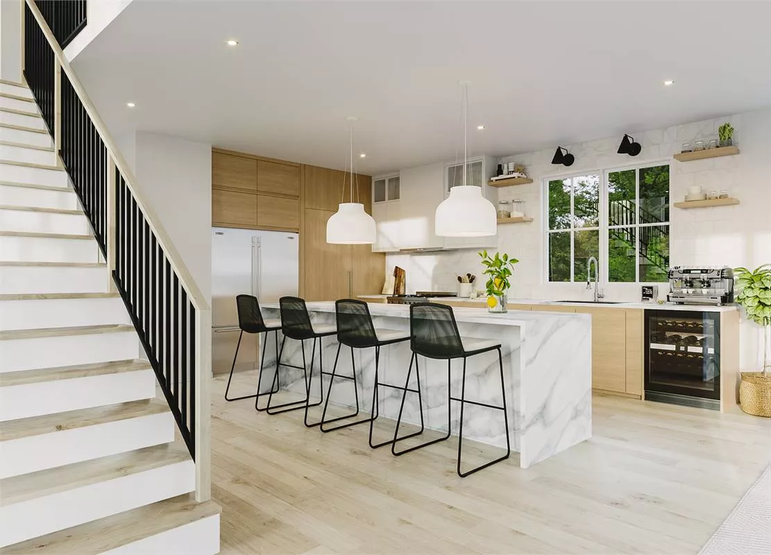 Immediately into the home you’ll find the powder room as well as a super handy laundry chute that goes directly into the home’s laundry room on the lower level. The kitchen has a large pantry and ample countertop space. There is a window over the kitchen sink and the dining room has three sets of sliding glass doors, a wonderful way to enjoy more mild weather months. The great room has a two story ceiling and a  fireplace, a perfect spot for family movie night.