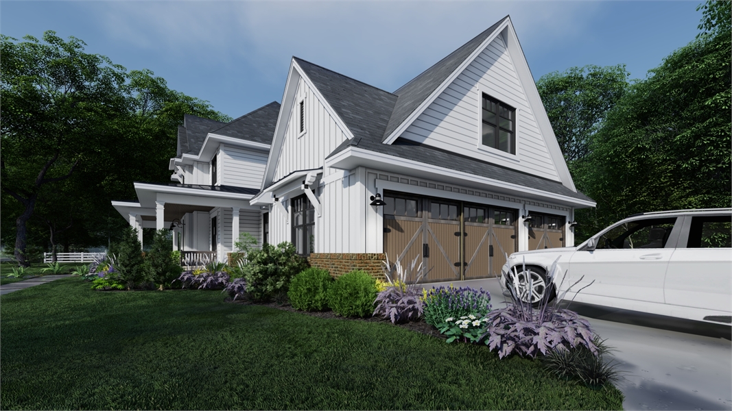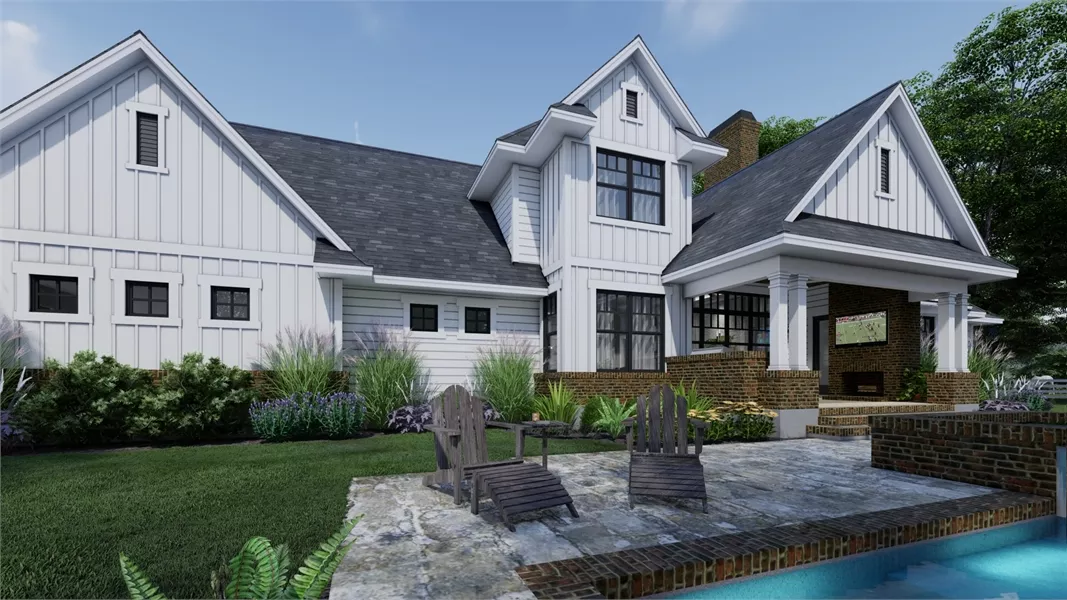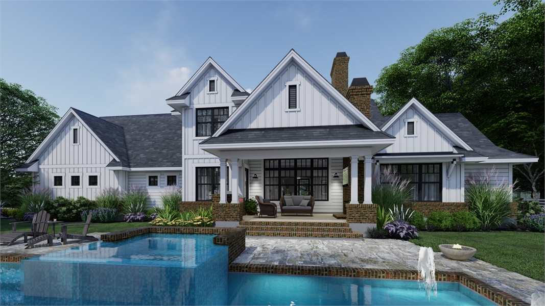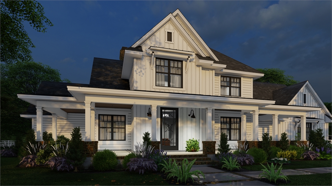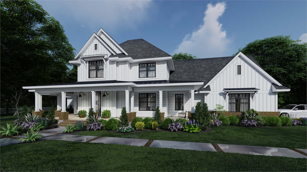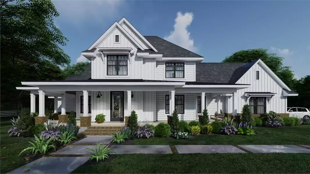 An absolutely stunning design makes this 2-story farmhouse style plan a must-see. Boasting 2,829 square feet of living space, this 4 bedroom, 3.5 bath home is perfect for a new or growing family, with tons of areas for everyone to enjoy! Modeled after the popular Spring Creek Farm (THD-7369), this new plan incorporates customer feedback and enhanced functionality throughout. The beauty of this home begins with first sight, as a beautiful wraparound porch captures your eye, as you imagine cool evenings spent sitting out front. Past the front porch, step inside on to the grand foyer, complete with a private study nearby. As you move further inside you will appreciate the open concept that creates a natural flow throughout. The rear-facing family room and its vaulted ceilings, joins with the gourmet island kitchen and breakfast nook, as well as your very own walk-in pantry! Directly off of the kitchen is the convenient mud room and laundry, which leads to the spacious 3-car garage. Back to the living room you will love the beautiful windows that bathe the area in natural light, as well as the nearby access to the covered rear lanai, featuring a built-in outdoor fireplace. The first floor is finished off with the amazing master suite, located off of the living room. Here, vaulted tray ceilings create a grand and open feeling, while the spa-style master bath and its dual vanities, join with a spacious walk-in closet, making your life as easy and relaxed as possible. The second floor is a result of customer requests, featuring an added 3rd bedroom, making the space wonderful for kids and guests alike. While two of the bedrooms share a full bath, the other has its own en-suite, making it the perfect spot for in-laws or visitors. Finally, a large bonus room sits over the garage, creating a great blank canvas for you and your family to put your own unique twist on this home. From a play room to a movie theater, or even just extra storage, the choice is yours!