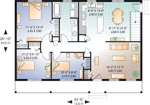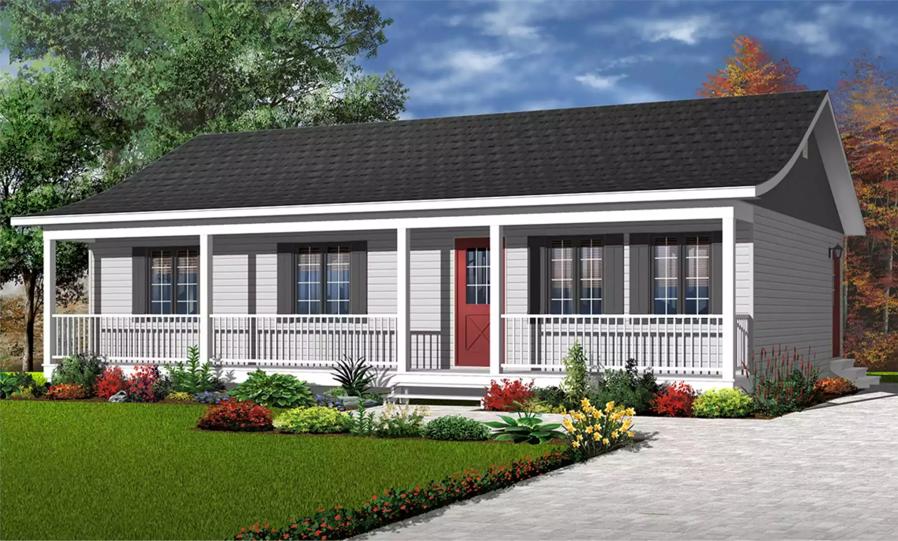 Suitable for practically any lot size and any climate, this timeless country style plan incorporates many traditional and fan-favorite design elements in to an affordable package. A straightforward exterior offers plenty of feelings of Americana, thanks in part to the large covered front porch, quaint shutters, and sloping roof-line. Enjoy a hot summer’s evening sitting out on the front porch watching the sunset while the kids play in the yard of this beautiful home. Inside, you will find 1,127 square feet as well as 3 bedrooms and 1 bathroom. The ranch styled layout creates an open space with natural flow. Entering this home, you find yourself in the living room and family room. From there, you can go to the hallway to your left and find 3 spacious bedrooms and a shared full hallway bathroom. A country eat-in kitchen features an elongated island and plenty of cabinet space, as well as an open dining room, suitable for a large table. As an added bonus, this home features an unfinished, walk-in basement space which makes additional storage both easy and accessible. While this home doesn’t come with a garage, check out many of our great garage addition plans and consider adding one for enclosed parking and storage at an affordable price.