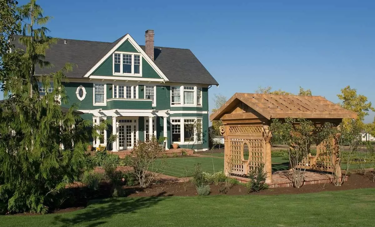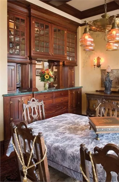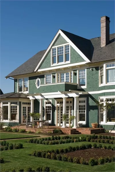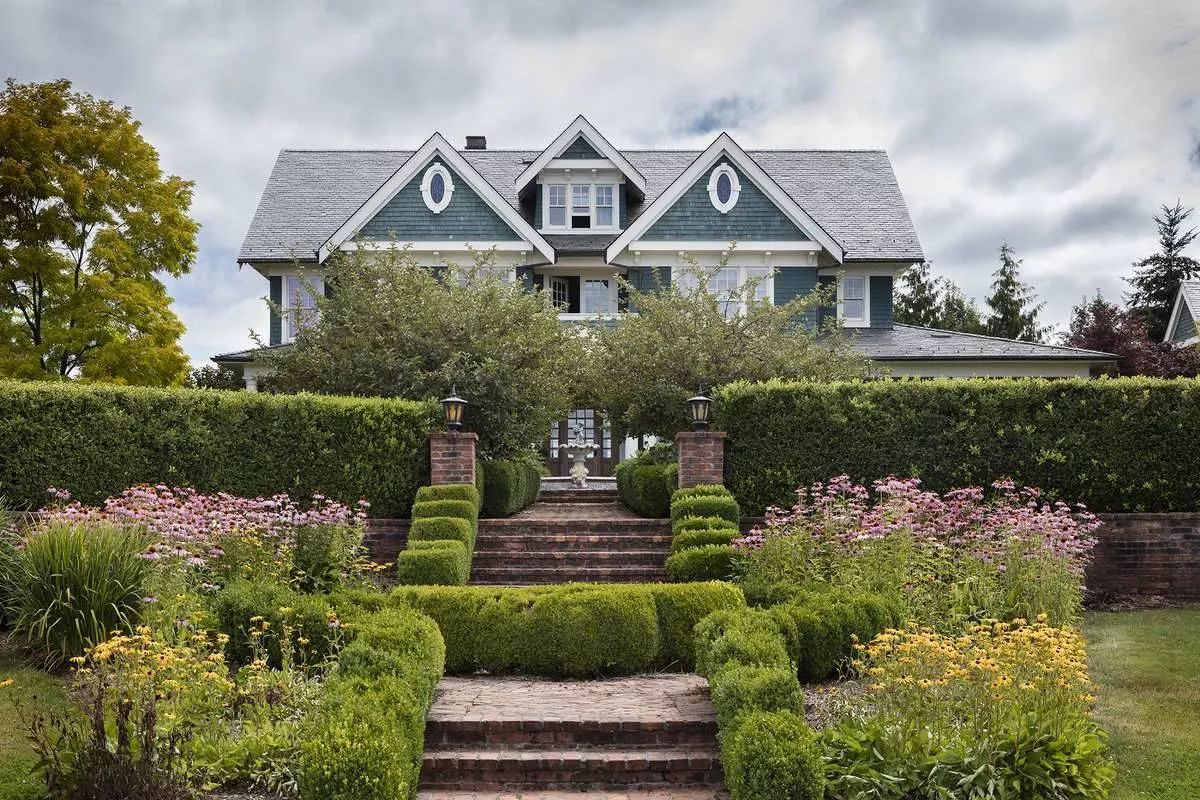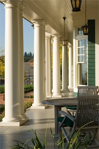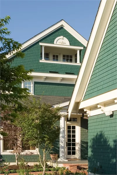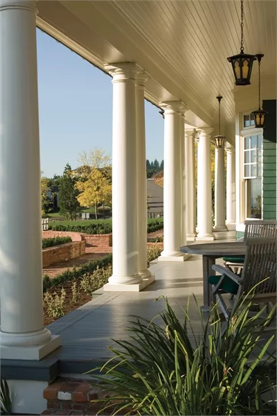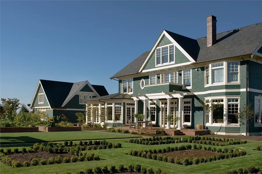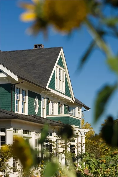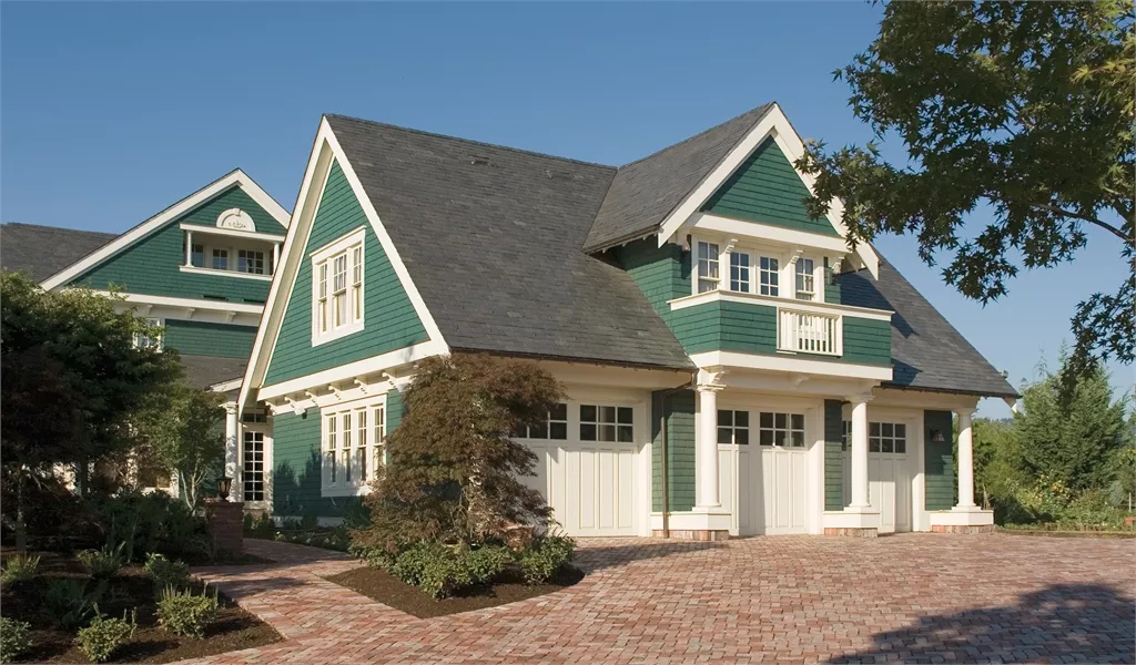 A breezeway links the side-access garage to the house with an anteroom that includes a coat closet, shelves for briefcases and backpacks, and a bench for removing boots. Above the garage, a two-bedroom suite provides independent living space.