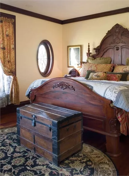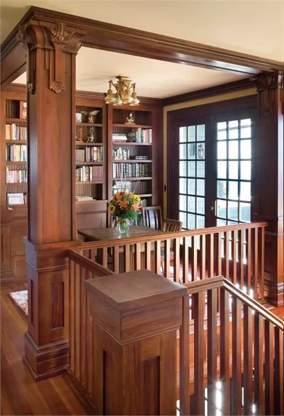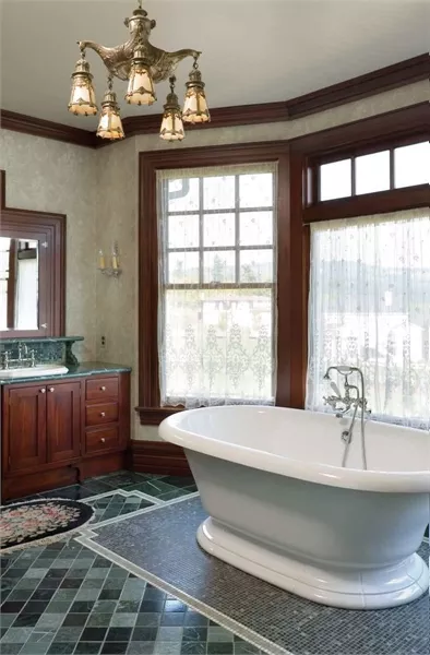 The upper level of this home accommodates three bedrooms, two baths, a full-service laundry room, and a master suite that's a dream come true. The master bedroom is divided into sitting and sleeping areas. French doors open it to a private deck. A two-sided fireplace warms both the sitting area and the bath. The highlight of the spacious bath is an oval tub tucked beneath a bay window.