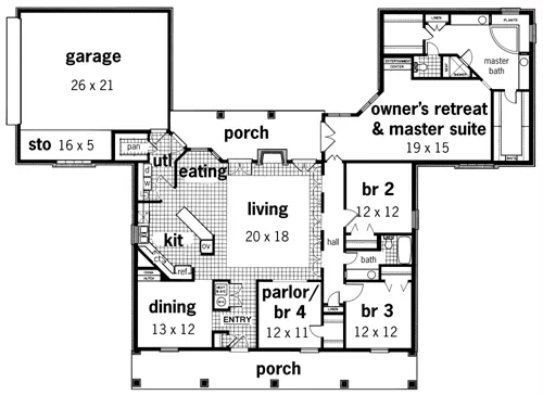 Except for the porch areas, this well-balanced traditional design is finished with no maintenance brick veneer. It is also a super energy saving plan featuring 2x6 exterior walls. The kitchen is angular to take advantage of the rear views and is open to the bay eating area and liberal sized living room. The formal parlor is open to the living area or it can be used as an optional bedroom by relocating the door to the hall. The master suite features private access to the rear covered porch, sitting area and a plush bath with twin giant size walk-in closets and a corner quarter circle whirlpool.