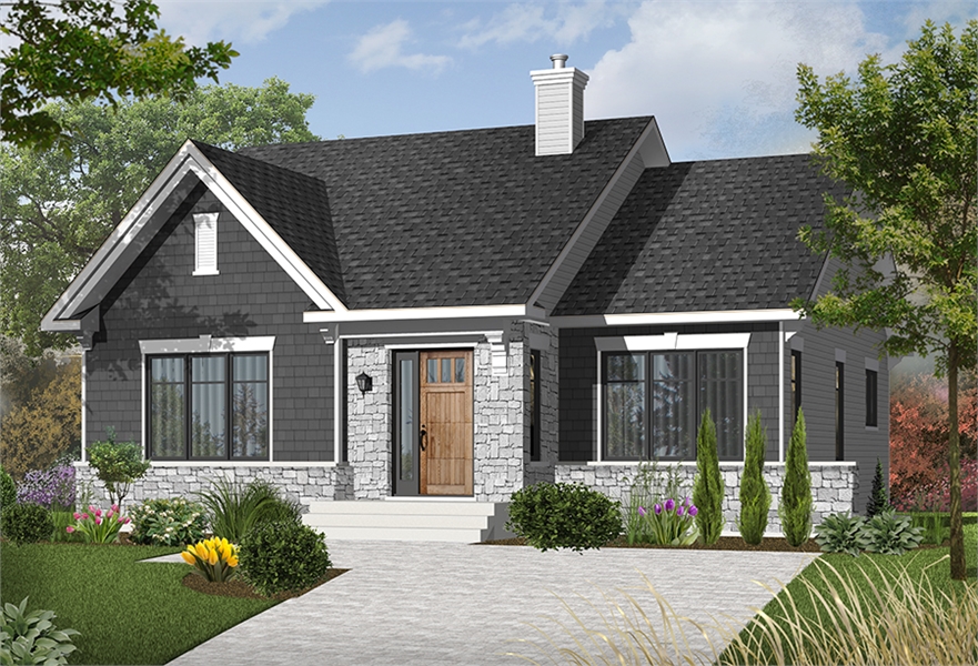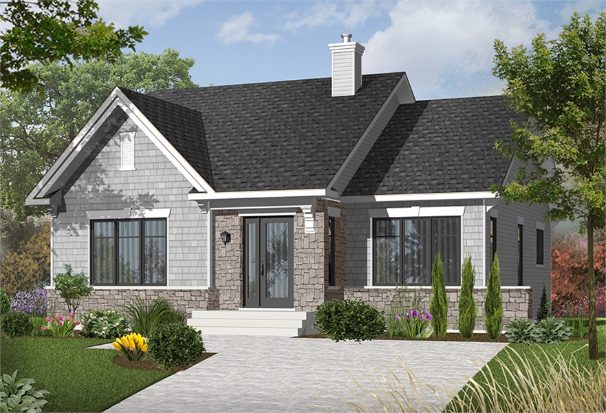 This 1,207 square foot cozy country cottage house plan with 2-bedrooms is a beauty. The charm is in the details of the country cottage; shingle siding and stonework, elegant trim and ample windows entice passersby and show pride of ownership. Within, a weather-lock entry leads to a central corridor. To the right, an intimate sunken living room gains an extra 6 inches in ceiling height and is warmed by the fire’s glow. The efficient U-shaped kitchen and adjoining dining room are bathed in light from a double garden door - an ideal exit to enjoy the back yard. Two bedrooms are divided by a hall laundry closet and 5-fixture bathroom complete with double vanity, spa tub and oversize shower.  If more space is required, a full basement offers the opportunity for expanded living or storage space.