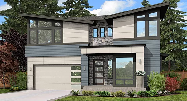 This three-bedroom, 2.5-bath contemporary house plan offers a total of 2,655 square feet of living area and exterior stone accents. Do you like to entertain? In this home plan, you'll see how the great room, dining area and open kitchen flow together for one amazing space. Other highlights of the home design include a versatile den, an outdoor living area and a luxurious master suite. Builders like the island snack space for four. On the upper floor, the bonus room would make a nice art studio.