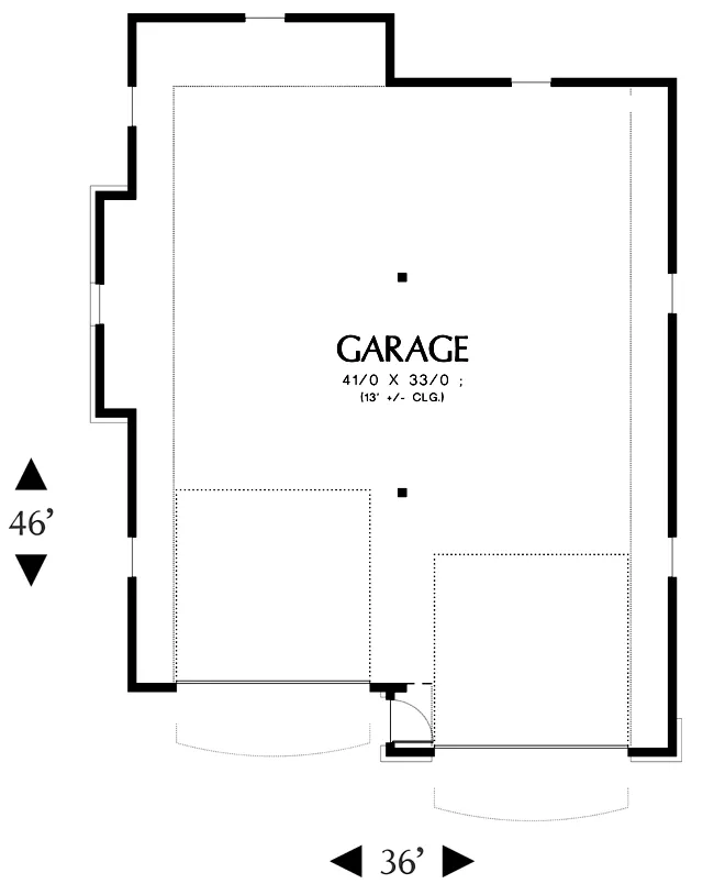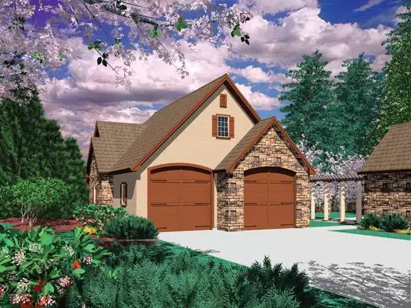 Perfect as an addition to a Tudor or French home, this two-car garage is designed in stucco and stone. Windows along all three sides and a multi-pane transom above allow natural light to fill the interior. Bumped-out space along the left side and at the back make it easy to add storage shelves, a potting bench or a workshop.