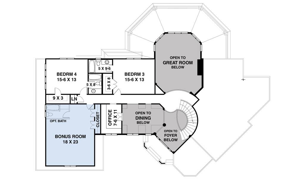 Hipped rooflines, stone accents and a commanding entry announce this luxury European-style house plan, with 3,125 square feet of living space on two stories, including four bedrooms and four baths. A fireplace warms the inviting great room in this home plan, where a dramatic ceiling draws the eye upward. Expand any gathering to the wraparound rear porch. The unparalleled kitchen boasts two islands, two dishwashers and a handy pantry. The formal dining room is perfect for holiday feasts; the curved snack area is more than adequate for casual meals. A barrel-vaulted ceiling adds interest to the posh master bedroom. In the personal bath, you'll find a garden tub, a refreshing shower and dual vanities. Don't overlook the vast walk-in closet. A nearby bedroom offers a walk-in closet, and could be used as a home office. Ascend the curved staircase to find two additional bedroom suites with walk-in closets, plus a second office. A large bonus room in this home design would make a nice playroom. Builders point out the basement level, which could be finished to make several more exciting rooms.