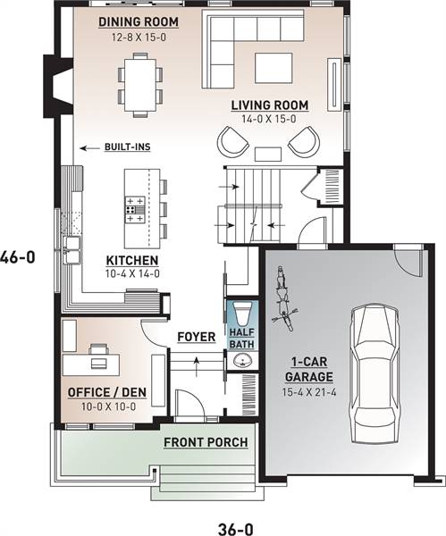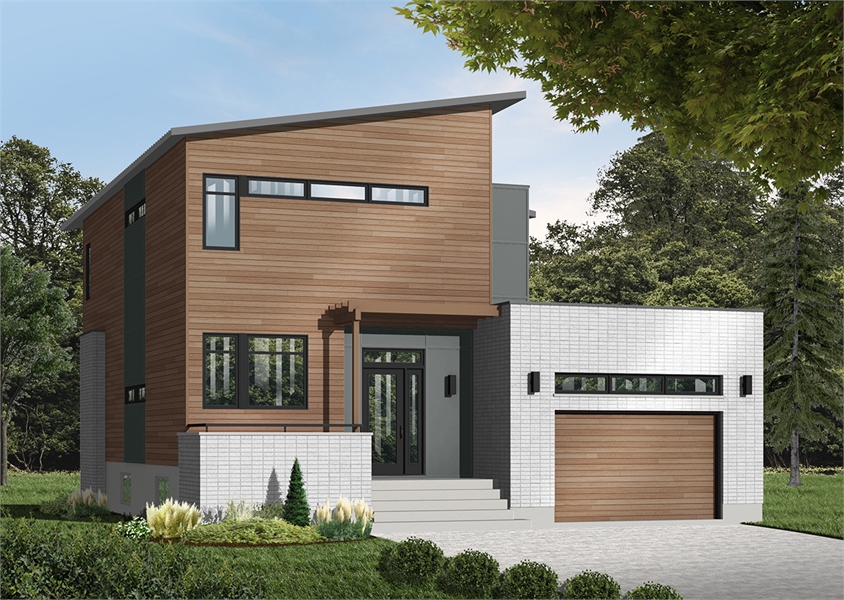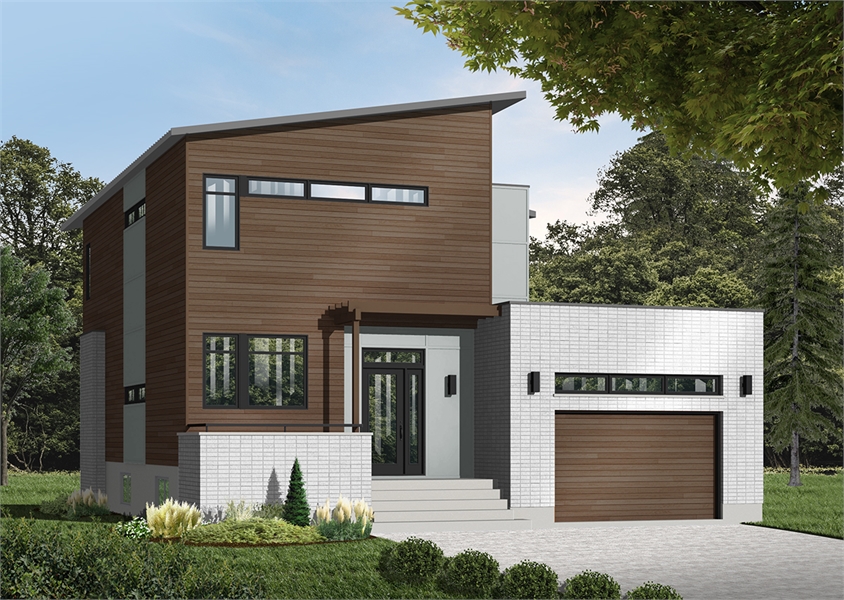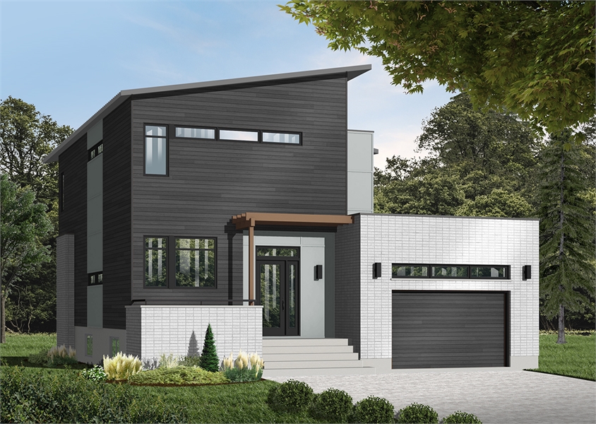 A mere 36- foot wide, 3-bedroom, 2.5 bath beautiful modern mid-century  house plan features 8 foot, 6 inch ceiling's throughout the main level. With 1,999 square feet of usable living space, this model is ideal for an average family. The office is located near the front entry, which makes it accessible to customers or guest for that work at home person. The open concept living area features a beautiful fireplace that adds ambience to the dining room, joining the living room and dining room is the kitchen featuring  a sizable island with eating bar, and walk-in pantry. The master suite is located on the upper level with a large walk-in closet and private bathroom that has a over-sized shower. Two additional bedrooms share a shower room. A laundry closet is located on the second level for convenience. The large one-car garage has direct access into the side entrance of the house. This house plan includes a simple exterior with accents and a sloped roof.