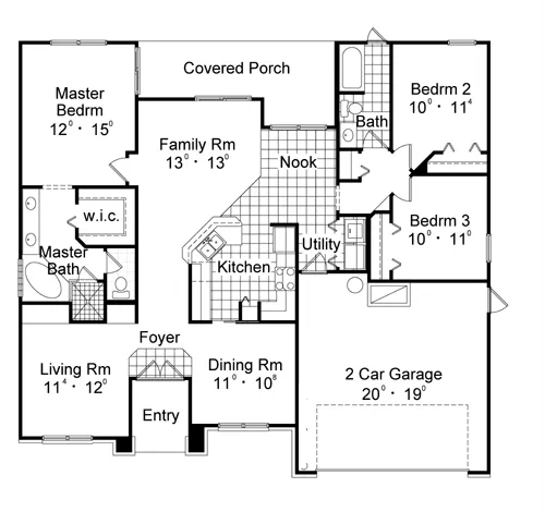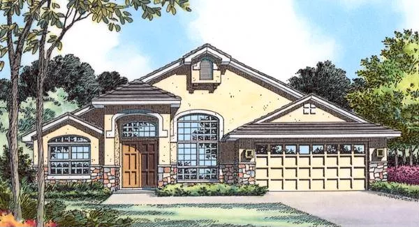 Textures of stone and stucco add warmth to this elevation, shown with the optional side entry garage. The formal living and dining room is flanked by the tiled foyer. The living room also has built in areas for cabinets or book cases. The family activity area holds the large kitchen which overlooks the nicely sized nook and family room, complete with corner fireplace wall. Of course the views to the covered patio are through walls of glass. Separate and private is the master suite with sliding glass doors to the patio. The master bath is well appointed and comes complete with dual vanity, corner spa tub, large walk-in shower, and private toilet chamber, not to mention a generously sized closet. Two secondary bedrooms near the kitchen share a pool bath. Note the niche in the hallway.
