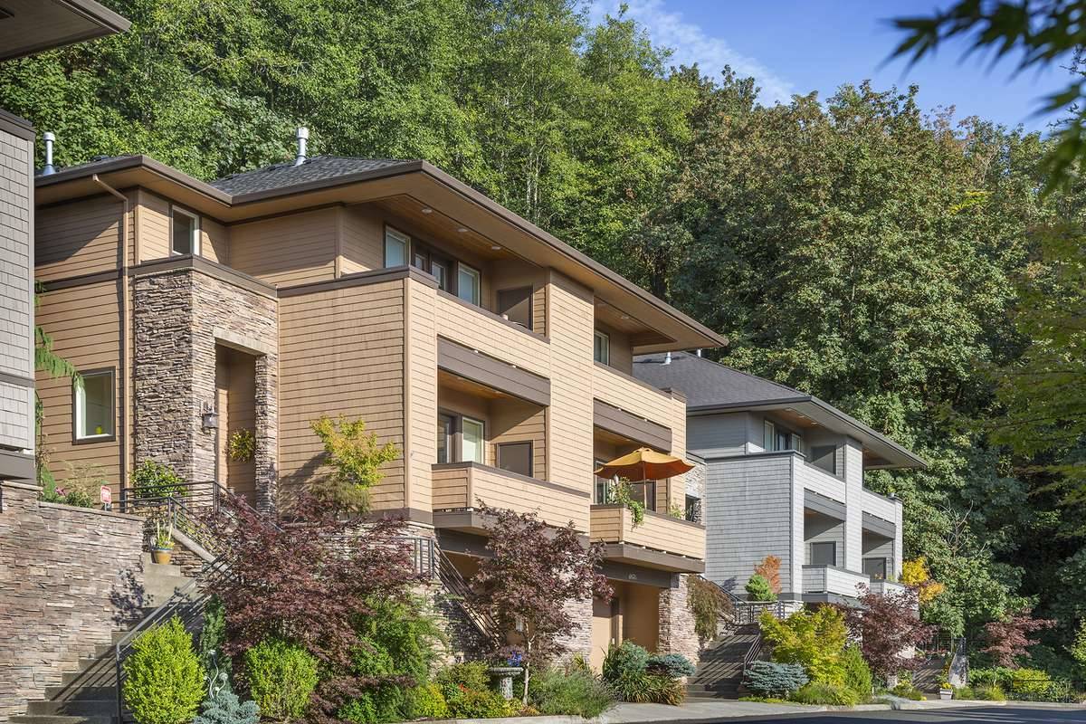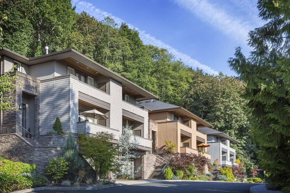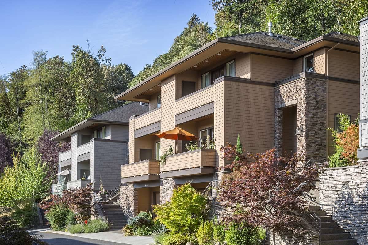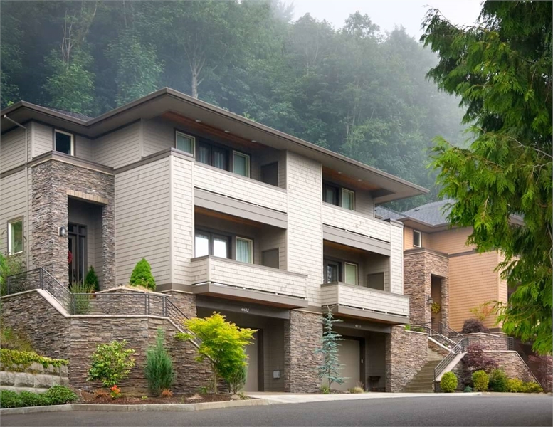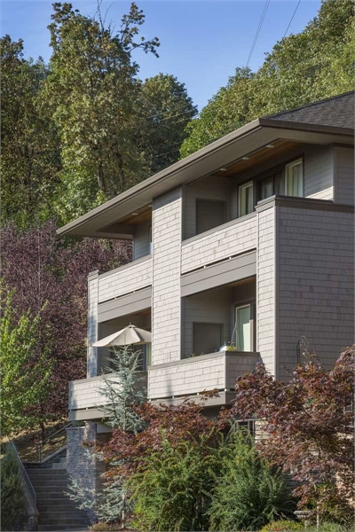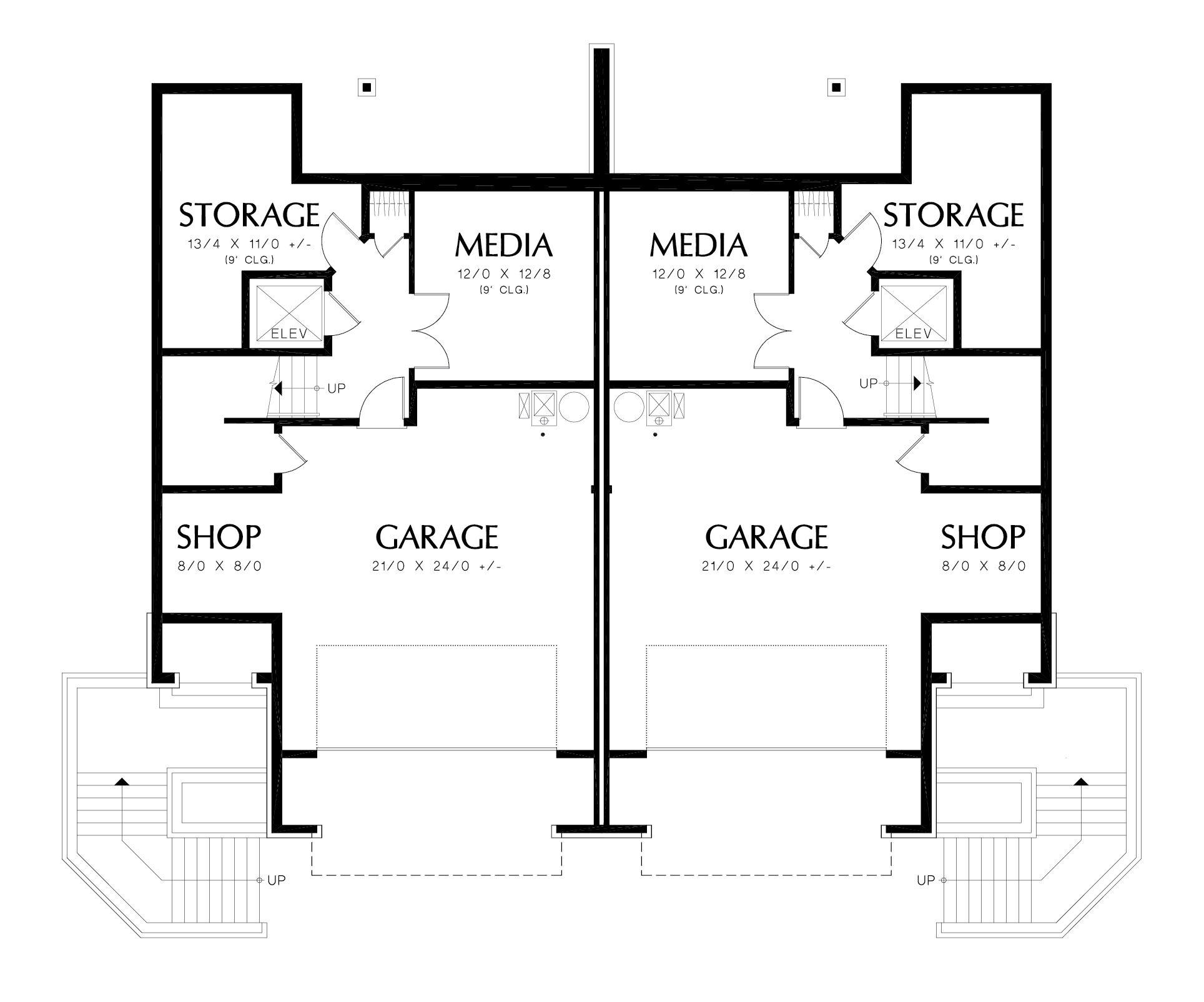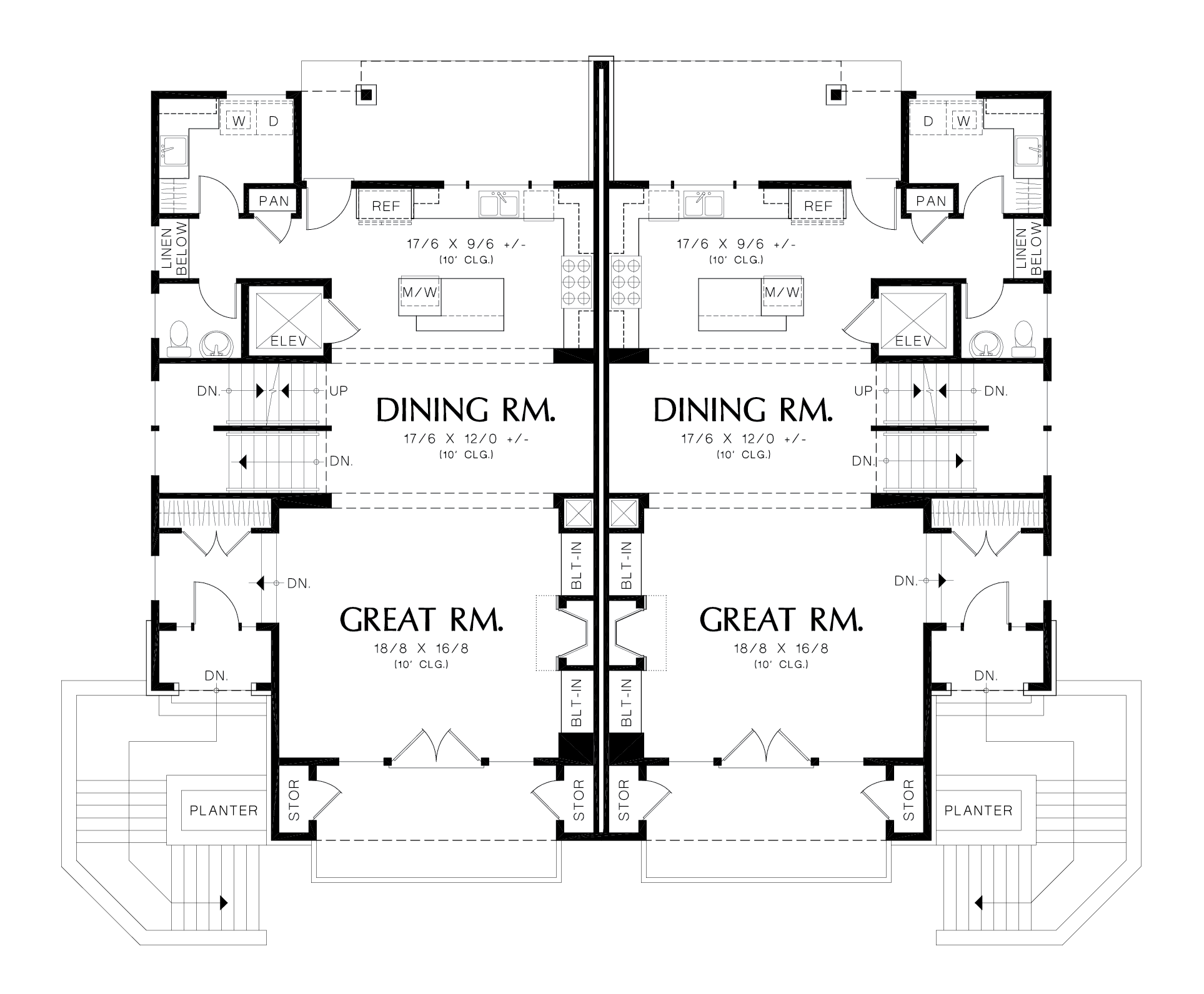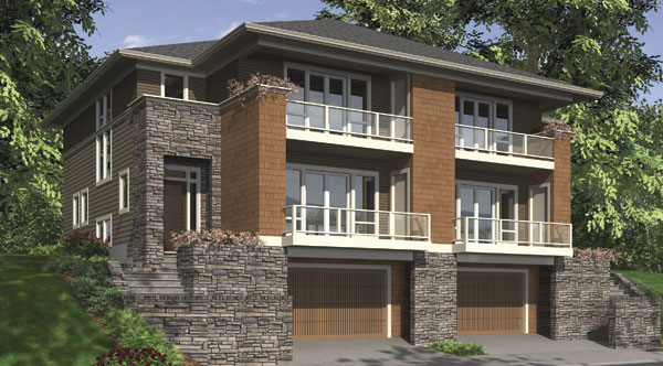 An ideal multifamily dwelling to tuck into a hillside, each unit of this home is contained to just 30 feet in width. Whether the view is to the front or to the rear, projecting decks on the homes upper levels will provide residents with a place to relax while soaking it in. Stone and brick accents on the faade offer a natural counterpoint to the glass and metal deck railings and windows. Stone retaining walls with planters can be built to lead up to the main doors. Inside, a U-shape staircase and an elevator connect the floor plans three levels, making it accessible for anyone. The kitchen, dining room, and great room are conveniently open, allowing ceiling beams, flooring changes, cabinetry, and built-ins to define the rooms. The great room features a fireplace flanked by media built-ins.