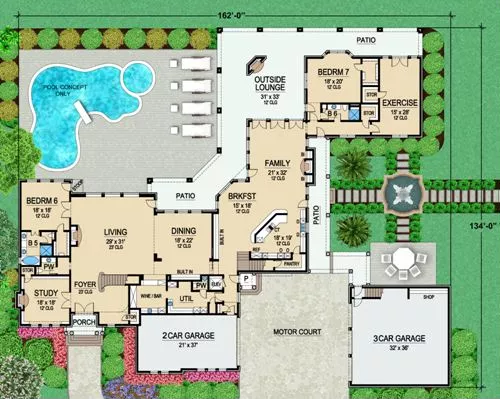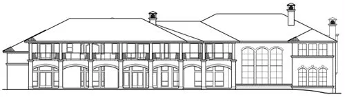 This Mediterranean luxury mansion house plan offers nine bedrooms! The motor court is flanked by two courtyard-entry garages; a four-car and a six-car. The two-story foyer is surrounded by the wine/bar room, stunning staircase to the second floor and a quiet study with warming fireplace and storage room. A family bedroom with walk-in closet, his and hers vanities, separate shower and tub sits in the rear of this plan. The living room and dining room are open to one another, and will both be warmed by the living room's fireplace and large bank of windows allowing the sun to stream through. The kitchen provides a free-standing breakfast bar to share with the breakfast area and family room. There area plenty of built-ins in the kitchen, as well as a large pantry. Three sets of double doors in the family room lead to the outdoor lounge with fireplace, surrounded by large decorative pillars that define the entire patio, lounge and verandas outside. A family bedroom with walk-in closet, storage and exercise room could double as an in-law suite. Upstairs, four bedrooms with walk-in closets and full baths share space with the game room, media room, reading room, storage spaces, and luxurious master suite. The master suite boasts a large sitting area, lavish bath with his and hers vanities, separate shower, garden tub, an office, his and hers wardrobes, and balcony access. Over the six-car garage is a two-bedroom apartment with two bedrooms, walk-in closets, two full baths, kitchen, breakfast area, den and laundry room, completing this Mediterranean luxury mansion house plan.