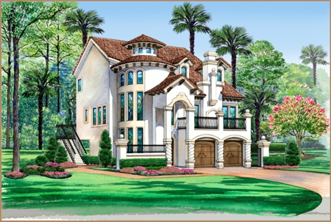 Balconies, towers and custom detail are but a few of the qualities that will draw you into this Tuscany luxury villa. The first floor offers two bedrooms with private baths, walk-in closets, access to the outdoor lounge and a two-car garage. The winding staircase, with its 36 ceiling, rises to the second floor and delivers you into the family gathering rooms. The family room has a vaulted ceiling, front overlook and balcony. The spacious kitchen offers a free-standing island with cook top. Next to the pantry is the entrance to the game room, where you will enjoy the rear overlook. A utility room and bar complete this level. On the third level of this beautiful house plan is the master suite with a large sitting room with fireplace, a bar with built in, large wardrobe and observatory deck. The luxurious master bath offers a vaulted ceiling, separate shower and corner tub, and his and hers vanities. You will love sitting on the overlook balconies of this three-story luxury Mediterranean house plan
