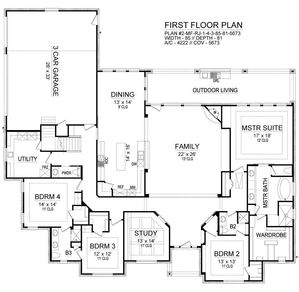 Southern charm meets European refinement in this totally accessible and beautiful family ranch-style home. A single floor layout of 4,222 square feet makes this plan great for family and friends of all ages and abilities, while open spaces and 4 large bedrooms provide ample comfort. The centerpiece of this home is its massive family room and nearby covered deck, along with the gourmet kitchen and dining room which sit directly off of it. Check out the master which is around the corner, along with a guest suite and nearby study. The other bedrooms are at the opposite end of the home, providing privacy for the kids and peace of mind for you. And just down the hall sits the laundry room and mudroom, along with access to the side-entry garage.