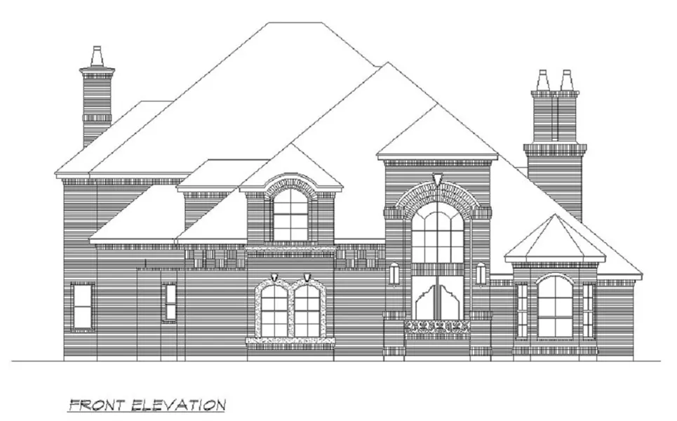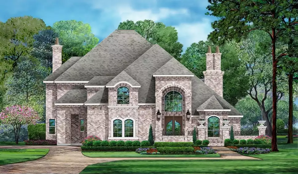 This traditional, European home plan offers over 4500 square feet of luxurious living space, five unique bedrooms and four full baths. Once you step into the home via the covered front entry, the foyer greets you with welcoming charm and elegance.  The open study and dining room share a fireplace, which is the anchor that divides the space between the two. The chef-ready gourmet kitchen has a center island, a large pantry, and a curved breakfast bar. Another fireplace in the family room warms this entire area. Prefer natural sun light? The family room has floor-to-ceiling windows, which blur the lines between inside and out. A secondary bedroom with walk-in closet and full bath sits off the family room, as well as a large utility room. The master suite has a 12’ trey ceiling and a shared fireplace with the luxurious master bath. The separate shower/tub, dual vanities and a spacious wardrobe also define the area. Upstairs, you’ll find a loft and a bonus room, which could easily double as an entertainment/theatre room. There are three additional bedrooms upstairs, too, each with walk-in closets. Two bedrooms offer trey ceilings, and two bedrooms share a Jack-and-Jill bathroom. From the game room, access can easily be had to the balcony. A three-car, side-entry garage completes this traditional, European luxury house plan.