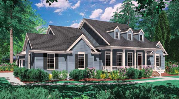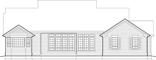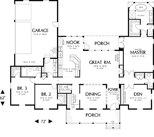 The master suite on the right side of the plan opposes a den with built-in bookcase. Both den and master suite open through double doors. A half-bath and closet sit in the hall between the two. The master bath is private and luxurious with a spa tub and compartmented toilet. Additional bedrooms share a full bath; each has a walk-in closet. The three-car garage connects to the home at the laundry room.