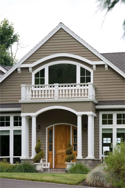 At the opposite end of the home, the master suite sports royal details. A bow window and elegant ceiling grace the bedroom. The bath contains two walk-in closets, a tiled shower, a spa tub and French doors to the porch. An additional bedroom, with its own bath, sits just across the hall.