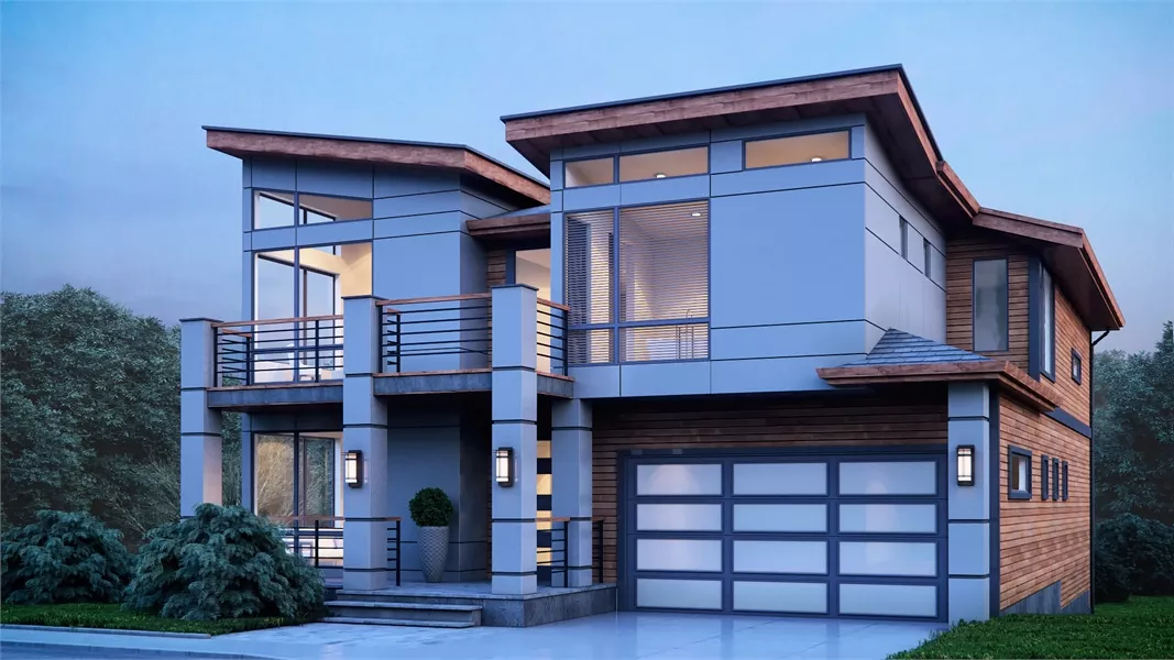 With views and cutting-edge beauty galore, this contemporary-style plan has some great surprises waiting past its stunning front facade. Inside, you'll quickly discover that the 2-story, 3,896 square foot home is actually a reversed layout. This means that 3 of the 4 bedrooms are on the bottom floor with the 3-car garage, and the master is on the second floor with the main living spaces. This layout means that you will have magazine-worthy views all year long! The upper floor also has a totally open concept layout, joining the vaulted great room with the chef's kitchen and the nearby dining room. Notice how this level also has 2 decks, a front balcony off of the master, and a covered porch off of the great room, perfect for entertaining crowds big and small.