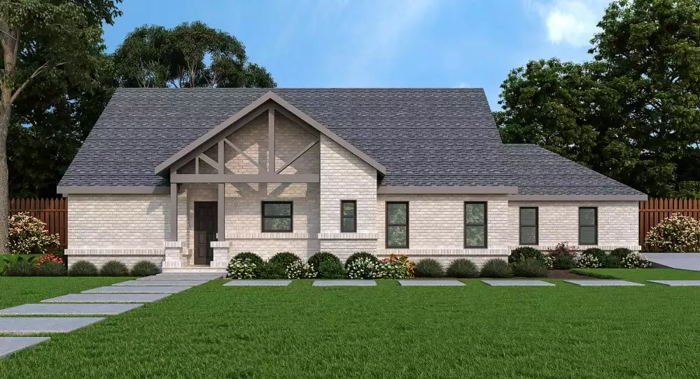 Strikingly simple yet exceedingly beautiful, this wonderful European-Craftsman blended design creates an unmistakable home. Featuring a ranch style layout of 2,556 square feet of space, the 3 bed 2 bath plan offers the perfect balance of affordability and style. Beyond the vaulted front entryway awaits an inclusive interior that has so much to offer. After being greeted by the grand foyer, move further inside to reveal the open dining room and family room. Notice how these spaces are bathed in glowing natural light, creating a seamless flow throughout. And just past the dining room sits the gourmet eat-in island kitchen, complete with a large walk-in pantry and plenty of cabinet and counterspace. Just off the kitchen you'll find the master suite which features a stunning spa-style bath and a massive walk-in wardrobe. There is even access to the laundry for easy weekend chores. On the other end of the home sits the auxiliary bedrooms, each with a walk-in closet of their own. There is also a private study with a built-in desk and storage, great for adding even more productivity to the home. And don't forget to explore the covered back porch and the 2-car garage to finish out the journey!