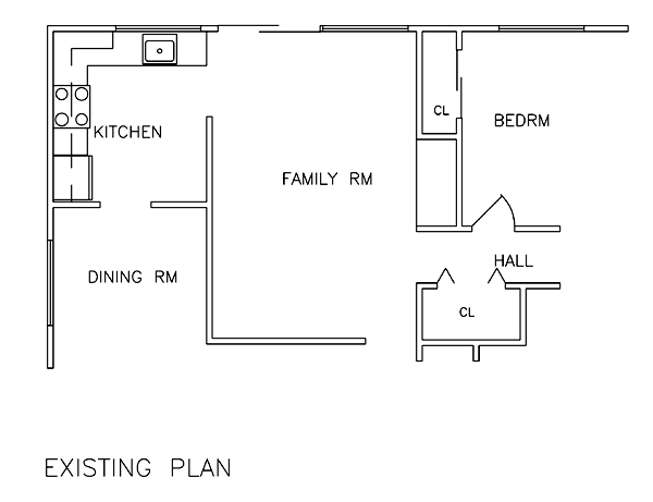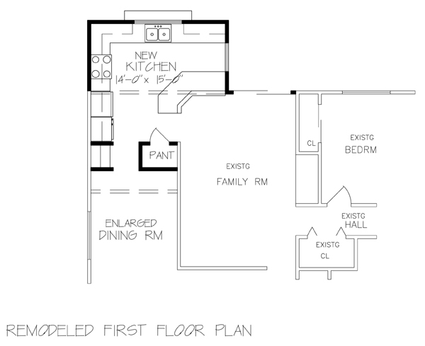 A smart, new, bright and cheerful kitchen, with a much more con-nected relationship to the adjoining family room, is the result of this trim 14'-8"x 7'-4" rear addition. Even the dining room gains a few feet in length, but the main beneficiary is the kitchen, which now includes some bulk storage, in the form of a pantry, and a serving buffet to the dining room. A stylish, angled, snack counter now separates the kitchen and family room, and an equally stylish half-round window is the focal point of the new rear wall. Skylites could be added to the kitchen addition if desired.