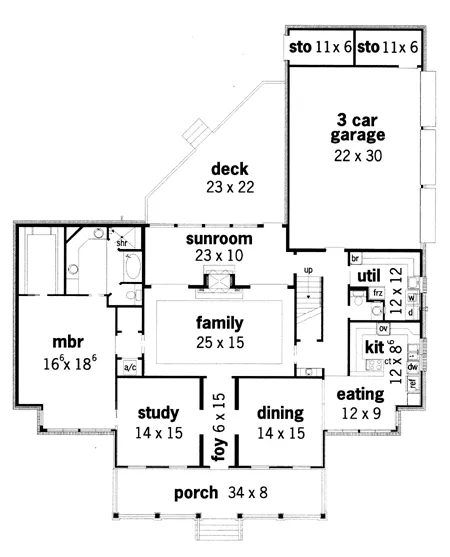 Brick and stucco are the materials used for the exterior of this traditional style, southern beauty. The family room features a tray ceiling, sunroom access and a wood burning fireplace with dual openings. The stairwell is conveniently placed to allow kids access to the sunroom or garage without passing through the main living areas. The sunroom opens to a large deck perfect for outdoor entertaining.