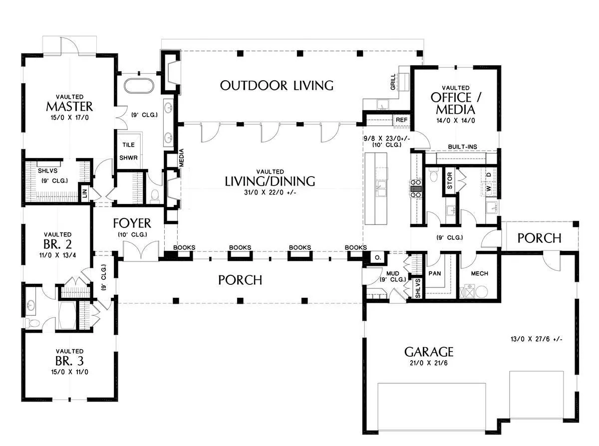 Shed dormers and graceful columns dress up the façade of this fabulous farmhouse style house plan, which includes three bedrooms, 2.5 baths and 2,798 square feet of living area. Beyond the front porch of this home plan, you'll love the open feeling of the vaulted living/dining room, where a fireplace adds ambience. The covered outdoor living area provides additional space for entertaining and relaxation. Note the fireplace and the handy summer kitchen. Back inside, the gourmet kitchen hosts a sizable island and a nearby pantry. The deluxe master suite flaunts a vaulted ceiling, a walk-in closet and direct access to the backyard. The private bath boasts a garden tub, a tile shower and a dual-sink vanity. Another full bath serves two more vaulted bedrooms in this home design. Our customers love the vaulted office, which could serve as a media room or a guest room.