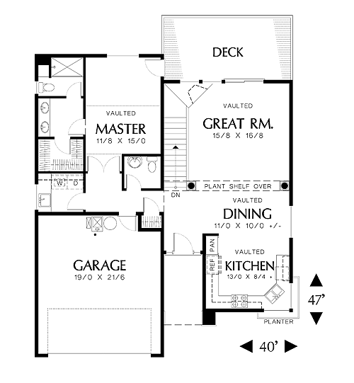 The master suite and public living areas are all on the main level of this charming cottage plan, designed to take full advantage of a narrow, sloping lot. Two additional bedrooms and a full bath occupy the walkout lower level. A vaulted ceiling soars above the kitchen, dining room, and the great-room, which are open to each other. Pillars and an overhead plant shelf delineate the dining area from the great room, which is furnished with a corner fireplace and patio doors to a rear deck. The laundry room is conveniently located just outside the vaulted master bedroom. The suite has access to the deck. The compartmentalized bath includes a double-sink vanity, a large shower, and a walk-in closet.
