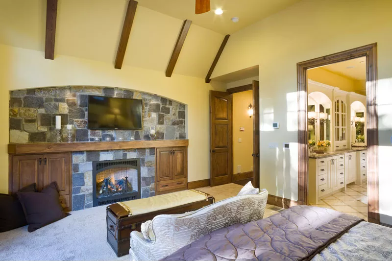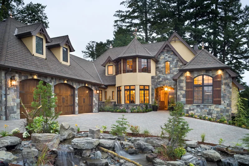 The exterior finish is predominately stucco, often rough troweled, and frequently with half-timbering. Exteriors also feature rubble stone, crazed brick, or clinker brick; all-stone, all-brick, and all-wood construction are sometimes used. Turrets with conical roofs are a common feature, as are faux dovecotes.