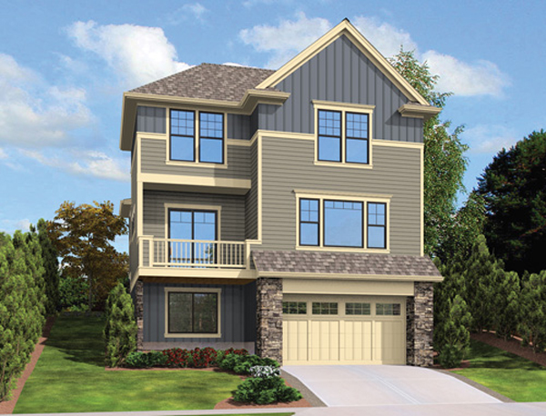 A compact footprint, sloping lot design and rear alley loaded garage make this an ideal plan for a hillside development. A lower floor garage with storage area leads up to the main street level, where an open floor plan provides all the family space. A front porch and rear deck make sure you can take advantage of living in a hillside home, while a large vaulted master bedroom provides space to retire. Three additional bedrooms provide space for families.