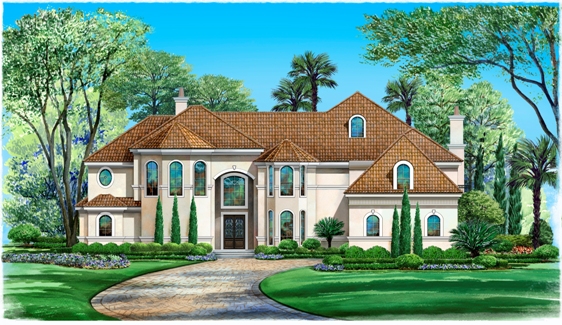 Your search for the perfect Mediterranean luxury house plan ends here. Entering the two-story Foyer, your eyes are immediately drawn to the curved staircase and large decorative pillars that divides the Dining room and the Living room. The Living room is directly ahead of the Foyer and has built-ins that flank the fireplace and is accompanied by a large bank of windows for great views of your backyard. The elegant Dining room is to the right of the Foyer, and is in close proximity to the pantry and Kitchen, ideal for serving dinner to family or guests. The Family gathering area consists of the gourmet Kitchen, a cozy Breakfast area and the Family room. The family room has many built-in shelves that are on either side of the warming fireplace. The Kitchen's island adds to the counter space and houses the cook top stove, while the two peninsula bars separate the Kitchen from the Breakfast area. Just behind the Breakfast area and Family room is a large patio, which provides some much needed shade in the summer's heat. The luxurious master suite boasts a bayed window and a lavish master bathroom that features his and hers vanity sinks, a separate shower, a garden tub, and a spacious wardrobe. To finish up the first floor of this house plan is a three car garage and a small storage space. On the second floor are three family bedrooms, all complete with a walk-in closets and a full bathroom. Also located upstairs is the Game room, Study, a large Storage room, and a Media room with its own small balcony. You'll enjoy the view of the Foyer and Living room as you look down on them from the loggia; you'll also enjoy the view of the backyard with the large outdoor lounge, which completes this luxurious Mediterranean style home.