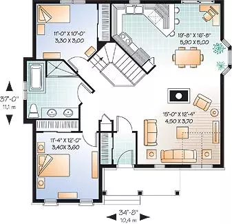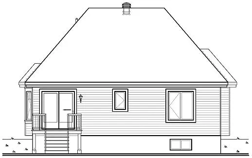 Forward-facing twin gables and double slope on the main roof create a pleasing combination of roof angles. A weather-lock vestibule provides convenient coat storage. Inside, an angled staircase creates a unique visual feature. Families and guests will appreciate an open living area with two-sided fireplace separating the living area from the bay windowed dining area. An alcove to the rear provides a cozy conversation area or computer nook. The unique angle of the kitchen provides definition to the cooking area and an adjoining eating bar allows space for visiting or snacks. Two bedrooms enjoy generous closets and are well separated by a 5-fixture bathroom with independent bath and large angled shower. An undeveloped basement is a blank slate for additional living or storage spaces.