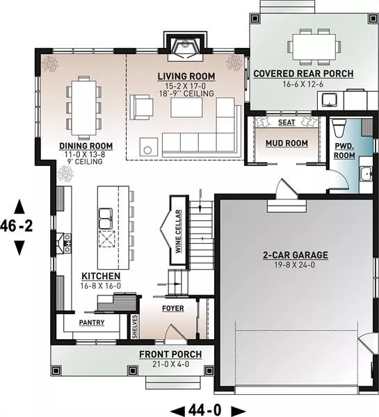 The open concept layout of this two-story modern farmhouse home plan is made to be enjoyed - and enjoy you will!  This home comes complete with 4 bedrooms, 2 full baths, a large kitchen with pantry and 2-car garage, making up the 2,496 square feet. From the moment you walk onto the inviting front porch, to seeing the dining room and the adjoining family room with the central fireplace and cathedral ceiling, you will feel welcome!  Practical features abound within this plan and all cater to your needs:  the mud room, located near the garage entrance; the easily accessible half bath on the first floor; and the large sheltered terrace that can accommodate an outdoor kitchen.  The master suite with double sink and large shower, along with the walk-in closet, is part of the second-floor plan.  In addition to the master, three secondary bedrooms, two with walk-in closet space, share a large full bathroom on the second floor.  You will also find the utility room upstairs, as well.  As your interests and your family grow and change, so too will your home.  The unfinished basement is made to accommodate the changes you will inevitably experience!