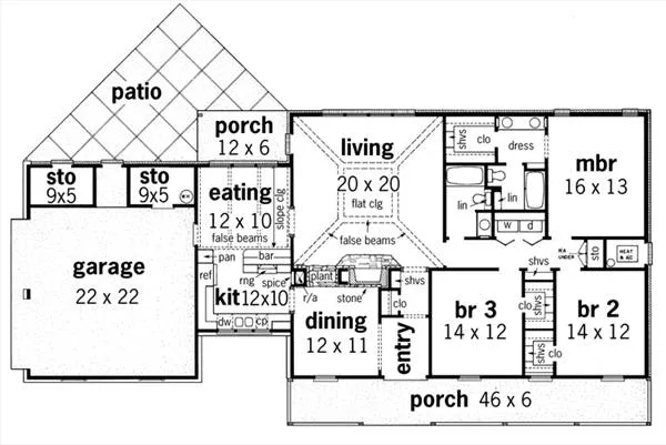 Clients often ask for home styles that are as welcoming and appealing as the older homes they grew up in. The full-length front porch of this rustic cottage creates an inviting look and it is large enough to accommodate swings or rockers. The country kitchen has a partial vaulted beamed ceiling and it connects to the great room, which features a massive stone fireplace-planter. Notice that all bedrooms are gracious size and feature large walk-in closets. French doors lead from the living room to a large outdoor living space, which is partially covered. A storage room can be accessed from the patio making it a perfect place to tuck the grill or lawn chairs.