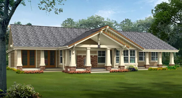 This outstanding Craftsman design delivers right from the front door, with a dramatic axis linking the entry, vaulted great room and outdoor living porch with a see-through fireplace. The deluxe master suite with his-and-hers walk-in closets and five-fixture bathroom also includes a spacious private covered porch. A generous flex room with its own private, covered porch can be used as an office, guest room or media room, while the oversized 3-car garage and utility room provides space for hobbies, crafts and storage. The elegant exterior uses a palette of shingles, stone, siding and board-and-wide-batten-trimmed gables to create a serene Craftsman composition.