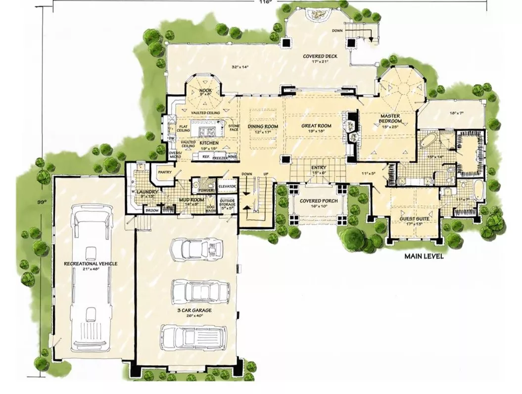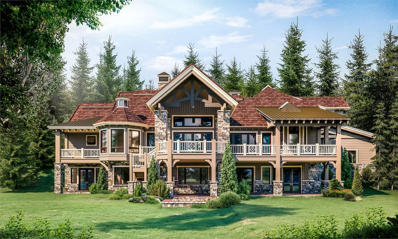 This rustic three-story design is stunning in size and has a mountain appeal. The exterior from front to rear is taken over by beautiful stone and wooden accents. The rear has balconies showcased throughout the entire upper and main level. With 6,630 square feet, six bedrooms, six bathrooms, and two powder rooms, you'll have plenty of space. The open kitchen features an island and is positioned next to the dining area. A fantastic outdoor living area boasts a fireplace, perfect for cool nights. The main floor contains the posh master suite, which can offer just about everything on your master wish list! The additional bedrooms are throughout the main, upper, and lower levels. This spacious home features a game room, a family room, an office, a media room, a storage unit, and a mechanical room. Don't forget this already gorgeous home has a three-car garage and an extra RV garage for those who love to travel on wheels! This design is a mountain home dream come true!