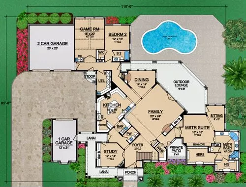 This opulent luxury mansion home plan boasts varied ceiling treatments and two-story ceilings adding volume to your living spaces. Fireplaces and plenty of built-ins are just some of the amenities in this luxury home. The elegant two-story foyer is flanked by the quiet study with access to the lanai and one-car garage and the two-story family room. The gourmet kitchen with free-standing island is centrally located to the bar and dining room, providing ease in serving your family and guests those special dinners. The family room features a warming fireplace, built-ins, and a bank of windows with a generous view of the concept pool. Easy access to the wine room and private patio can be achieved through the family room. The luxurious master suite offers a bed alcove and sitting area with access to the outdoor lounge, wine room and private patio. The master bath boasts his and hers vanities, separate shower, corner garden tub and separate his and hers wardrobes. Beyond the utility room, is a family bedroom with private bath and walk-in closet. The game room offers a bar and mud room for taking off those shoes when entering from the two-car garage. Upstairs, two family bedrooms with walk-in closets and private full baths share space with a reading loft. An overlook and loggia offer stunning views from above to the luxury mansion home below.
