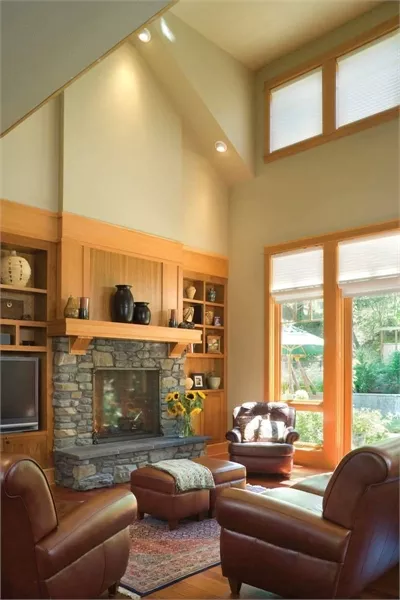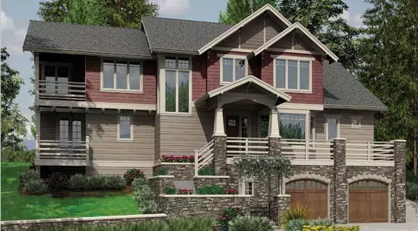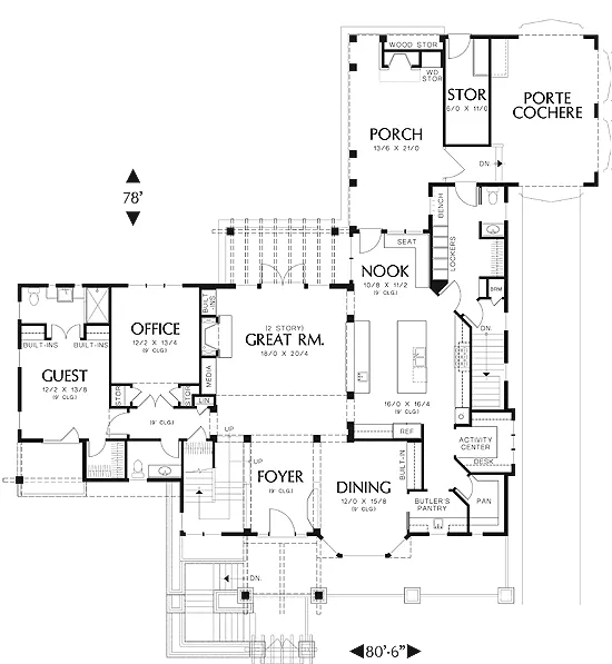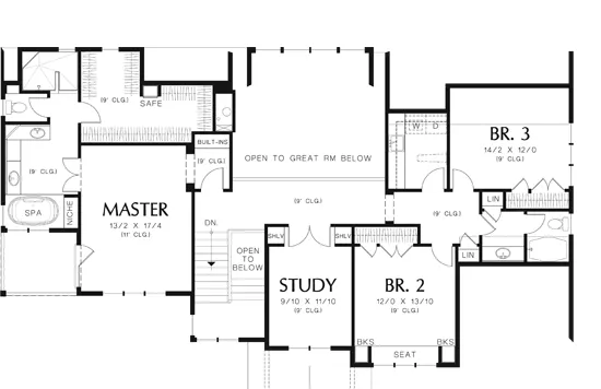 Where privacy and peace are desired, the home provides an office and a guest suite, accessed from a hallway off the great-room. The office has a pair of closets for storing reference materials and files. The guest suite includes a private bath, a walk-in closet, and French doors that lead to a front deck.