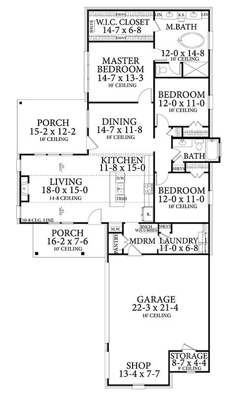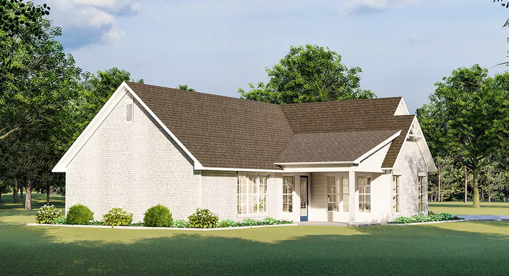 Front and rear porches lend a country feel to this affordable house plan, with 1,782 square feet of living space, along with three bedrooms and two baths. A fireplace and a sloped ceiling add interest in the spacious living room of this home plan. The high ceiling continues into the island kitchen, which boasts a nearby pantry. Serve formal or casual meals in the cheery dining room. Step outside for coffee and a breath of fresh air. Relax in the quiet master bedroom after a busy day. The private bath flaunts a garden tub, a separate shower and a dual-sink vanity with knee space for makeup. Note the handy shelves and drawers in the walk-in closet. Two secondary bedrooms in this home design share a full hall bath. Builders point out the two-car garage, with its handy shop area and storage room.
