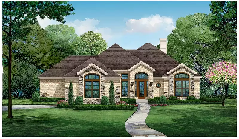 Elegance and luxury abound in this compact 4-bedroom European ranch home plan with a charming stone exterior. The cozy foyer welcomes you into this 2,398 s.f home with an open, vaulted family room dramatic corner fireplace and access to the covered patio. To the left of the foyer is an elegant dining room that is situated adjacent to the gourmet kitchen for ease in serving family and guests. A quiet study with closet and trey ceiling is beyond the dining room, and has access to the hall leading to the side entry, two-car garage. Two family bedrooms, each with walk-in closets, share a Jack-and-Jill bath. The rear bedroom offers access to the back yard and breakfast room. The octagonal windows in breakfast room offer bright mornings, while the gourmet kitchen breakfast bar seamlessly separates the two rooms. In the right corner of the home plan is the third family bedroom with trey ceiling, large closet, and access to a full bath in the hall. This luxury home is completed by the fabulous master suite that boasts a trey ceiling, patio access, and a luxurious master bath with his and hers vanity, separate shower and garden tub, and a large walk-in wardrobe with built-ins.