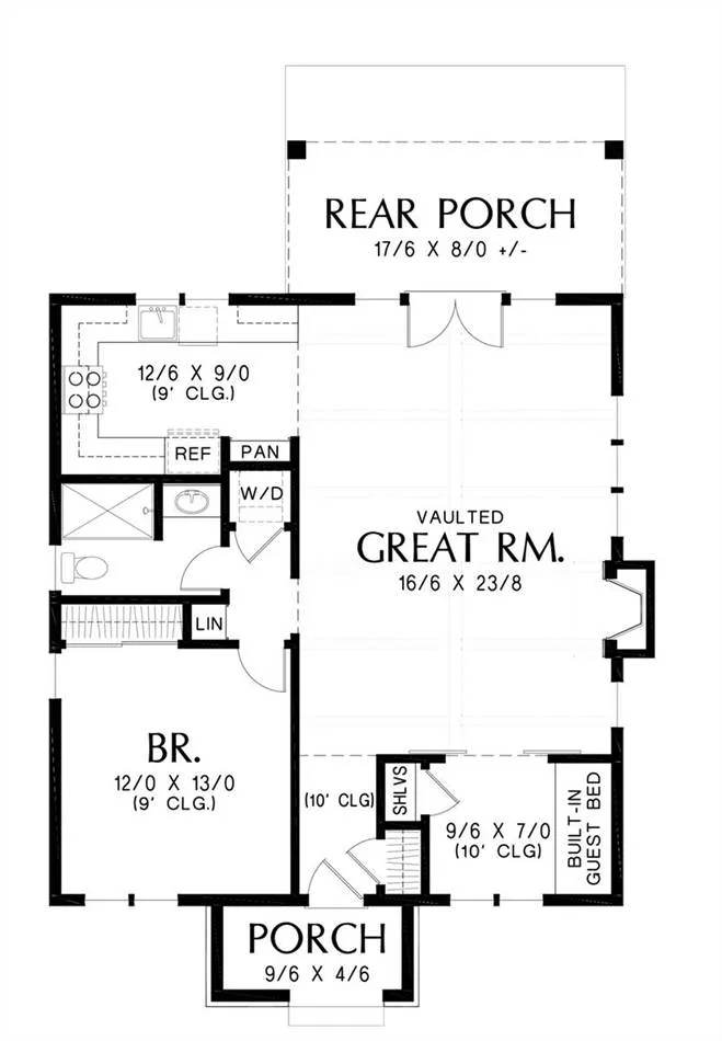 For fans of tiny living, look no further!  This Craftsman style plan offers a perfectly practical home in an attractively lovely package. A quaint archway defines this front façade and provides this tiny home with a grand look. Stylish combinations of stone and stucco make for a charming curb appeal. Inside you will find a fully functional 960 square foot floor plan that includes all of your amenities as well as 1 bedroom and 1 bathroom. Beyond the front porch and foyer, you enter in to an amazing vaulted great room complete with a great fireplace. Tucked away at the front of the home there is a small room behind some sliding doors. This space features a built-in bed that folds down, but can also function as an office when guests aren’t around. Off of the great room the country kitchen is fully equipped for even the biggest entertainer. A single bedroom and full bathroom complete this home, providing everything that the new homeowner or someone looking to downsize and live simply could need.