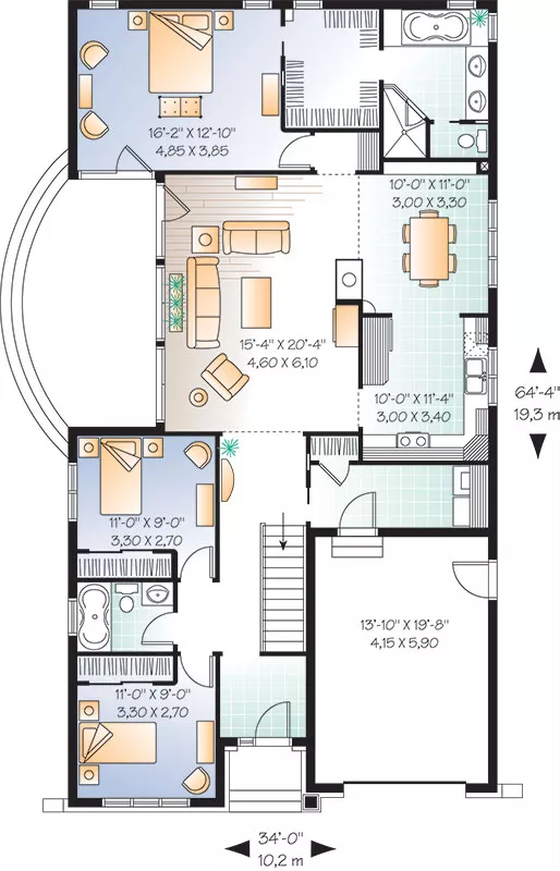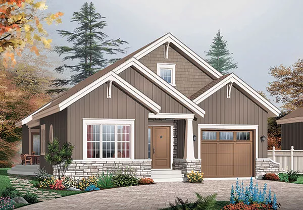 Craftsman details, like brackets and a tapered column, embellish this three-bedroom home design. Note the home's narrow width, which allows it to be built on virtually any lot. A sidelight brightens the foyer, which leads first to the two secondary bedrooms and a shared bath. The central great room hosts any gathering in comfort and style. The efficient kitchen serves the versatile dining area. A fantastic garden tub anchors the posh master bath.