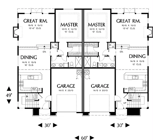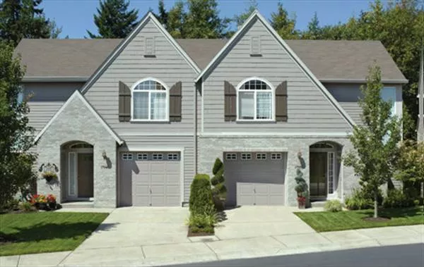 A first-floor master suite is a convenient trend. This one has a walk-in closet, twelve-foot tray ceiling and bath with dual sinks. Space for a stackable washer/dryer is nearby. The upper level features two additional bedrooms with private lavatory areas in a shared bath.