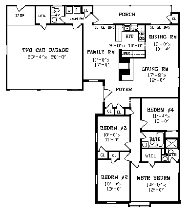 The living and dining rooms make up a formal entertainment center and boast a two-way fireplace shared by the cozy family room, opposite. The kitchen joins the open arrangement, offering a breakfast bar and sliding doors to access the rear porch. Four bedrooms, including a roomy master suite, make up the sleeping wing of the home.w