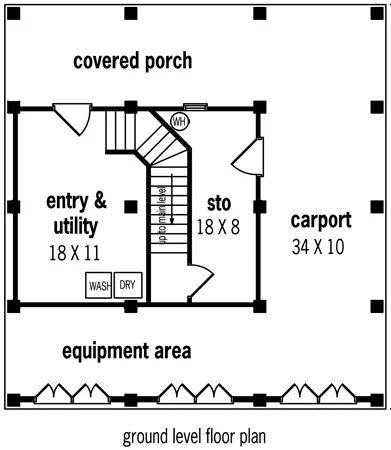 Designed as an affordable beach cottage, this two bedroom doll house has a full length front porch to enjoy sunsets and beach scenery. The ground level can be used as an open carport. It also houses an enclosed stairwell entry to the main level, a utility room and storage area for lockout storage.