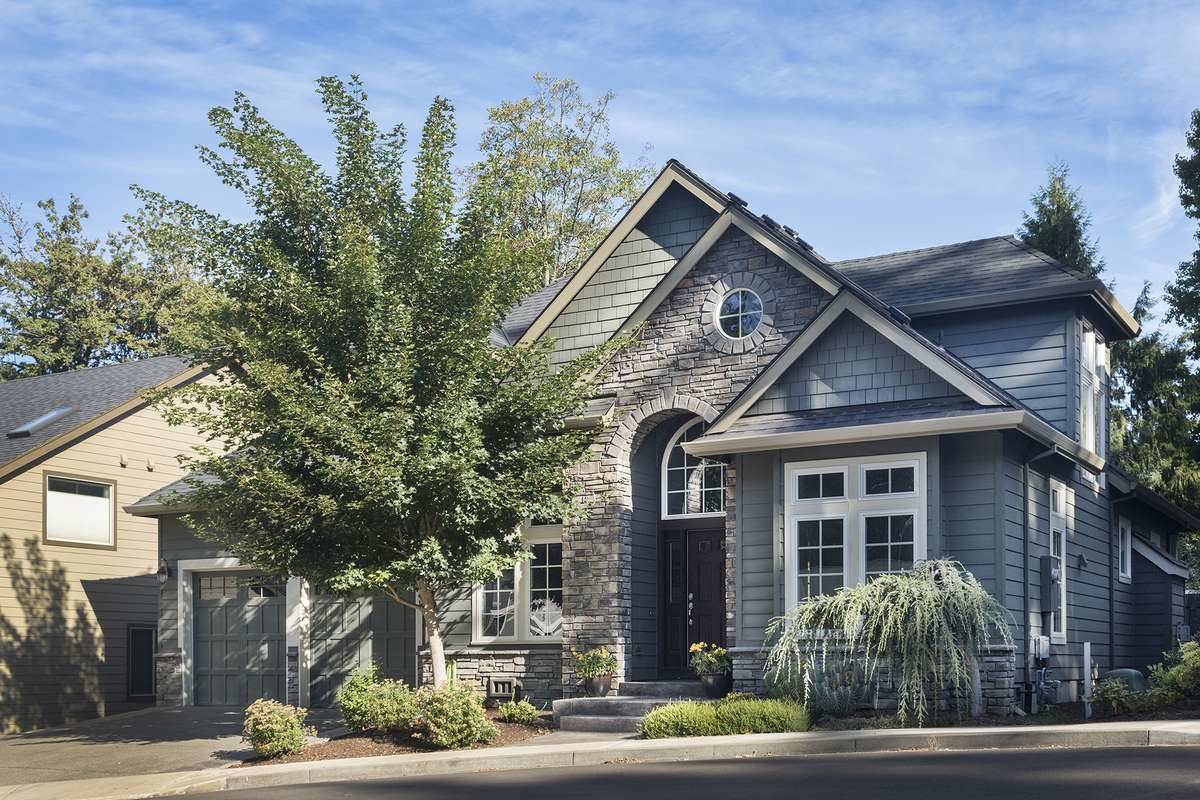 Multiple gables paired with a charming dormer give this home an exciting exterior. A tall arched stone entry with brick and a large transom, cast light into the two-story foyer.