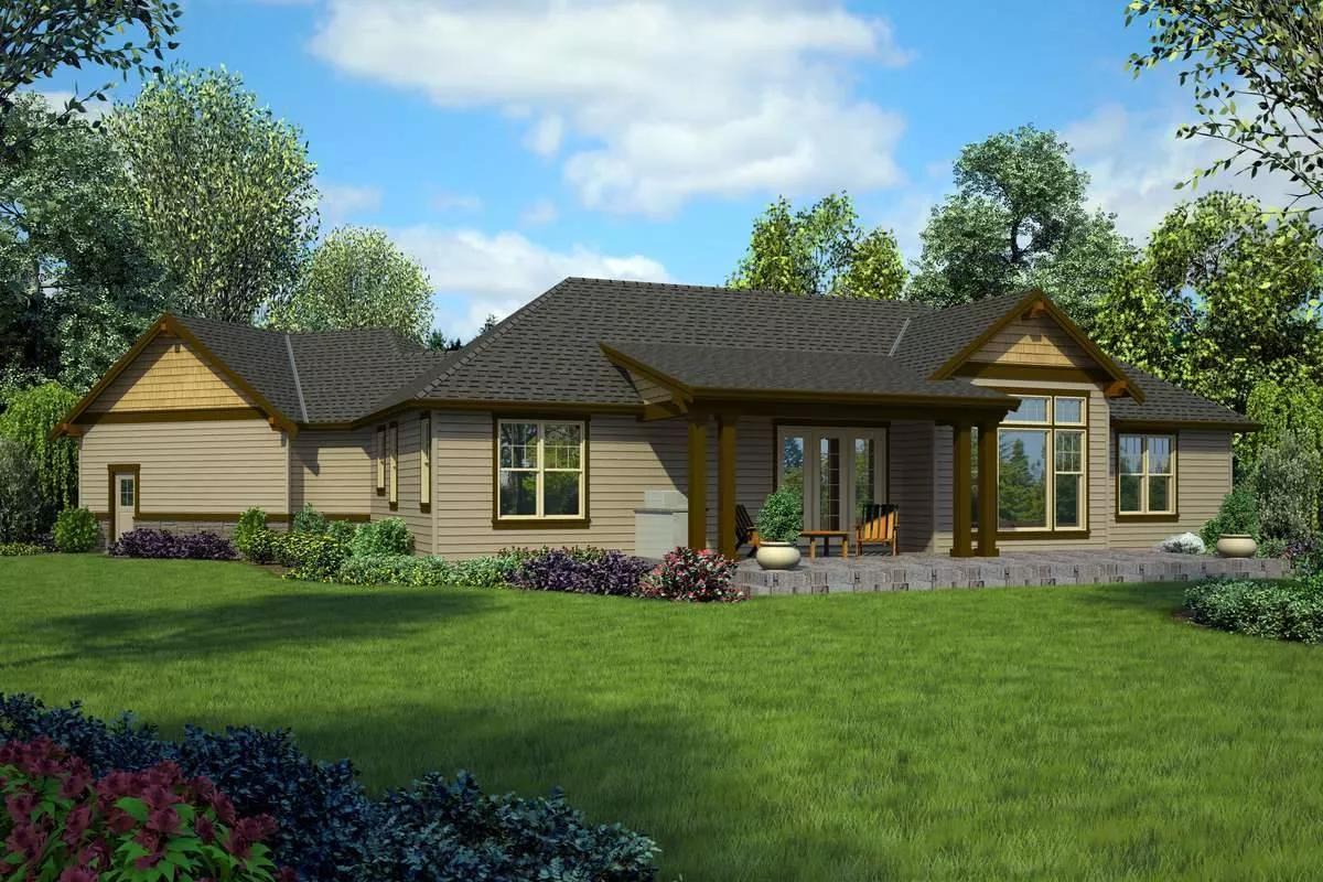 A 1,953 square foot, ranch-style layout enhances the beautiful functionality of this country Craftsman plan. Subtle touches of stone and exposed wood create an attractive curb appeal, while features such as a 3-car garage and a large covered porch add practicality to this family home. Inside, you'll discover that this home is perfect for entertaining and raising a family, offering inclusive spaces such as a vaulted great room which seamlessly joins with the island kitchen and dining room. The master sits nearby, offering a large spa bath and an even larger walk-in closet. Meanwhile, the other 2 bedrooms sit at the other end of the home, sharing a private bath.