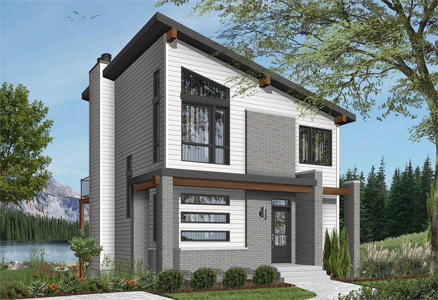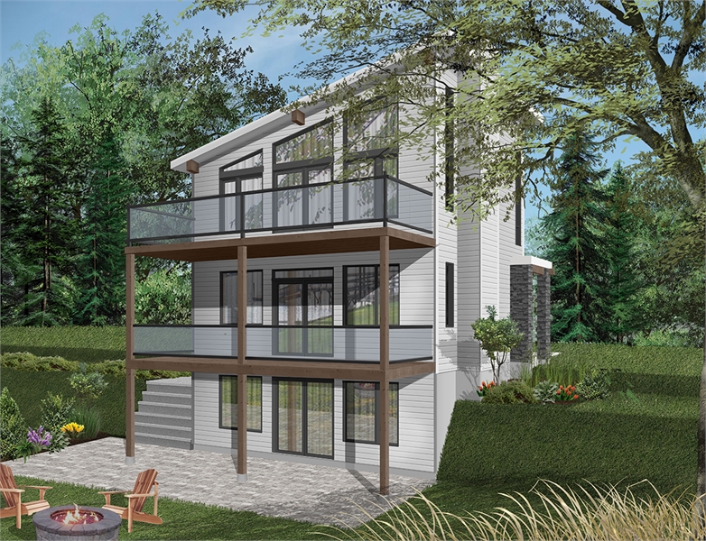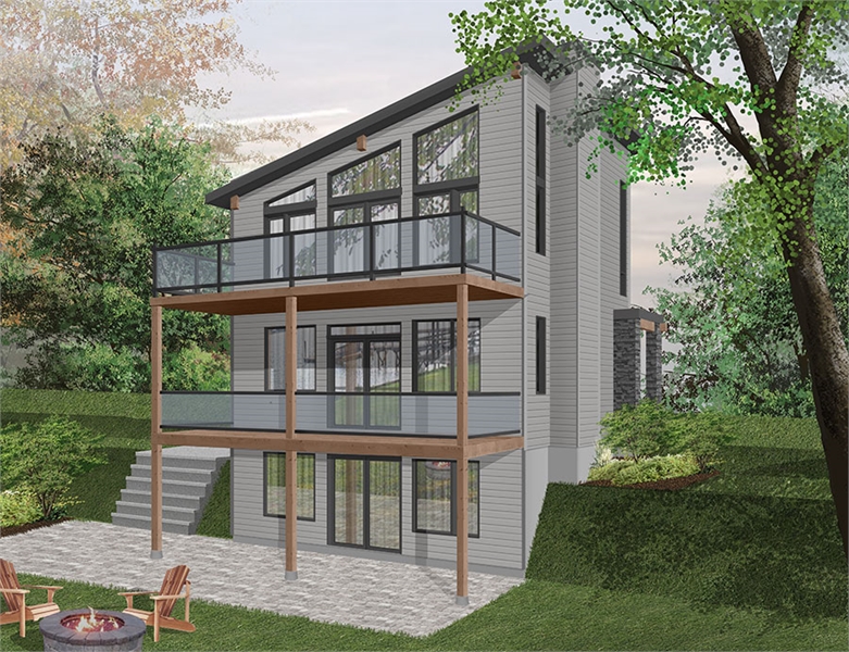 3-bedroom, 1 bath, 1,344 square foot modern style chalet house plan.  Ideal design for lakefront land or panoramic view.  9' ceiling on main floor.  Home office or guest bedroom on main floor.  Open kitchen living room concept.  Fireplace in living room and also in master suite.  Landry area located in walkout basement.  Master bedroom with fireplace, walk-in closet, access to family bathroom and access to a large private terrace.  Large family bathroom on second floor with separate shower and bath.  Walkout basement. Many foundation options are available.