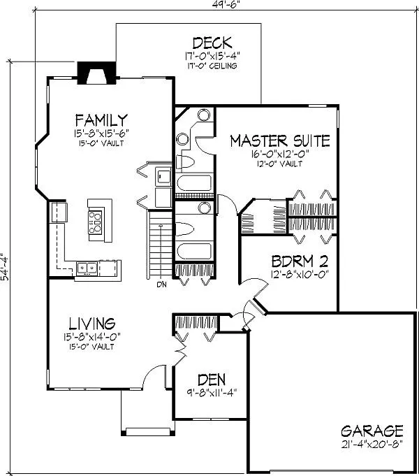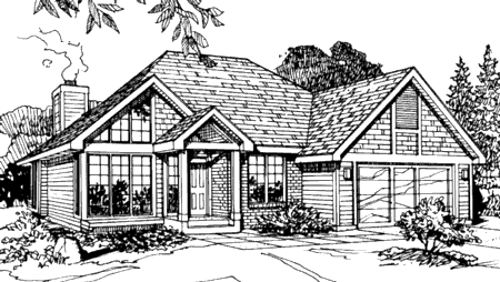 Vaulted ceilings and transom windows give the interior of this plan a light, airy feel. Transom windows climb to the peak of the vaulted living room. The rear family room, with its own vaulted ceiling and a fireplace, is equally as dramatic. Between, the island kitchen allows the family chef to keep an eye on the action during formal or casual times. The vaulted master suite features a skylighted private bath and a walk-in closet. A second bedroom and a den that may serve as a third bedroom have easy access to a full bath.