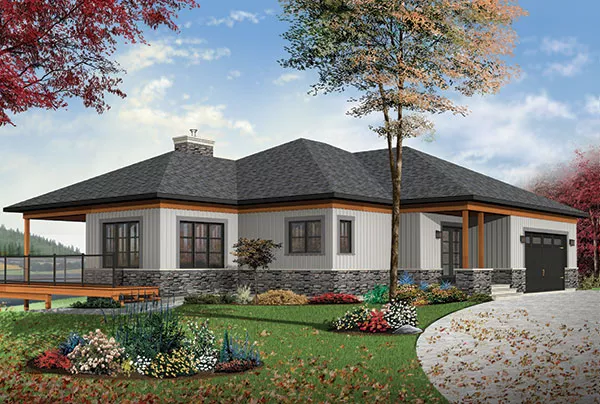 Perhaps one of the most beautiful and versatile plans that we offer, this contemporary style plan is a wonderful option to consider as a lake or mountain home. Thanks in part to the stunning covered wraparound porch and walk-out basement, this 2,890 square foot home has no shortage of views that will take your breath away. Amidst the 2 levels of this home you will find 4 bedrooms and 2.5 bathrooms, making this plan a great option as a vacation home or a year-round dwelling. Contemporary modern styling's see different elements such as stone, wood, and glass incorporated together to create an attractive and inviting home. The covered front porch and 2-car garage are only the beginning as you move inside past the grand foyer. A spacious kitchen and eat-in island are great for entertaining, while a dining room nook provides one of many accesses to the wonderful covered back porch. An expansive family room and fireplace overlook the rear of the home, allowing you to enjoy all of the gorgeous views all year long. A first floor master suite at the other end of the home provides a private retreat, while the spectacular bathroom redefines relaxation. The basement level of this home is the real treat. Here you will find 3 bedrooms and a shared full bathroom and an additional half-bathroom, as well as another living room and fireplace. The large common areas in this home are perfect for entertaining guests while your kids have friends over in the basement, allowing for multi-level enjoyment. The addition of a large unfinished space allows you to put your own personal finishes and touch on this home to make it truly fit your lifestyle to the fullest.