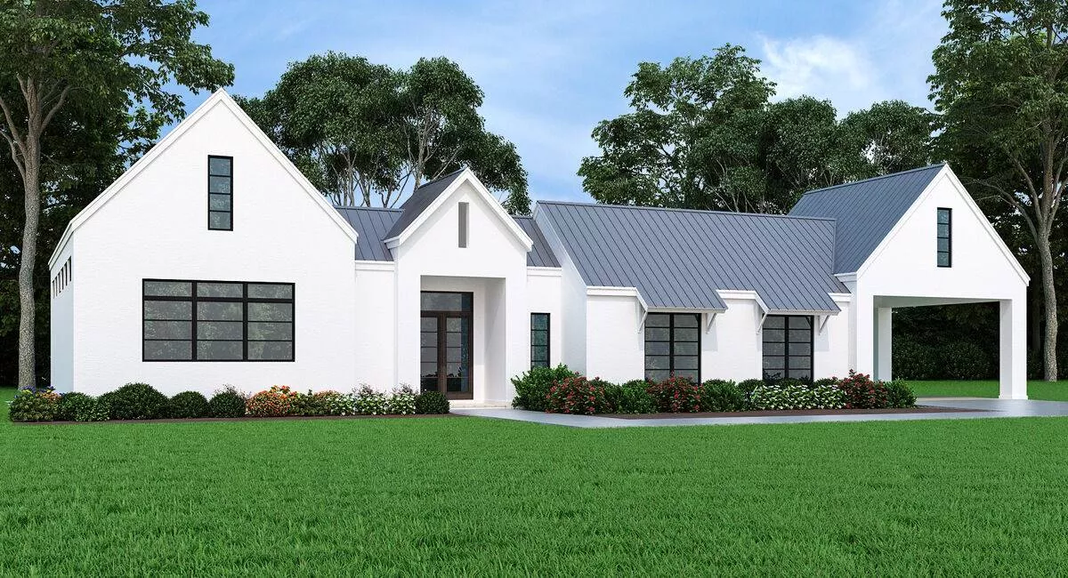 This clean lined transitional country house plan blends the farmhouse style ribbed metal roof with stucco providing a friendly elegance to 1 story 3 bed, 2.5 bath family friendly design.