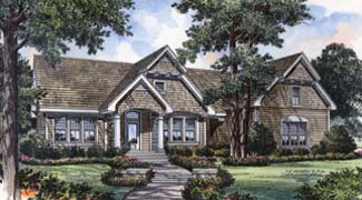 Columns, gables and arches enhance this one-story country-style home. Beyond a modest entry porch, the foyer welcomes guests and offers them a powder room where they can freshen up. The central kitchen is open and inviting. It serves the dining room and the breakfast nook with ease. A fireplace warms the vaulted family room. Check out the outdoor spaces beyond. The deluxe master suite is everything you dreamed it would be. A versatile bonus room sits above the two-car garage.