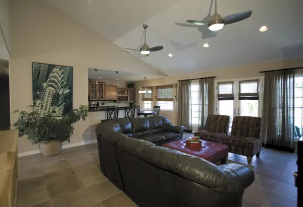This traditional ranch design features 2,275 sq. ft. of living space. One of today's most popular features is a master suite which is isolated from the other bedrooms. This master suite measures 14'x18' and is highlighted by a trey ceiling. Spacious his-and-hers closets flank the hallway which leads to the master bath. Separate vanities and a garden tub as well as a shower and a commode closet complete this area. Double French doors lead from the master suite to a deck.
